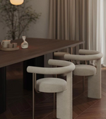 A contemporary statement piece with bold geometry and soft curves. Featuring a rounded upholstered backrest and cushioned seat, the chair balances modern aesthetics with comfort. Supported by asymmetric legs—one upholstered, one metal—it adds a sculptural touch to any dining setting.