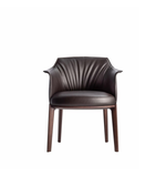A refined dining chair featuring a sculpted wooden frame and softly pleated leather upholstery, offering a perfect blend of comfort, craftsmanship, and contemporary elegance.