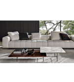 A plush modular seating system designed for modern living. Upholstered in Sablé 01 Bianco fabric, its bold volumes and deep cushioning offer absolute comfort, while the polished bronze-finish metal base adds a touch of refined elegance. Available in multiple layout combinations for larger or compact spaces.