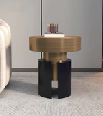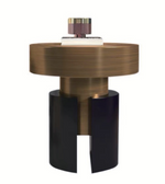 A sculptural design with a bold round top and contrasting base. Finished in black and brushed gold, this table adds a modern accent to any room. SIZE: 450*500 MM