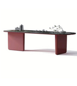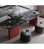An elongated oval design with a polished marble surface and bold red base. A modern centerpiece for dining or meetings. SIZE: 2000*1000*850 MM