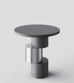 A contemporary side table featuring stacked cylindrical forms with a polished metal accent. Its sleek black finish and sculptural base bring a modern edge to any setting.