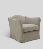 A cozy, slipcovered armchair with soft curves and a relaxed silhouette. Designed for effortless comfort, its fabric drape and plush cushioning bring a warm, lived-in elegance—perfect for calm, inviting interiors.